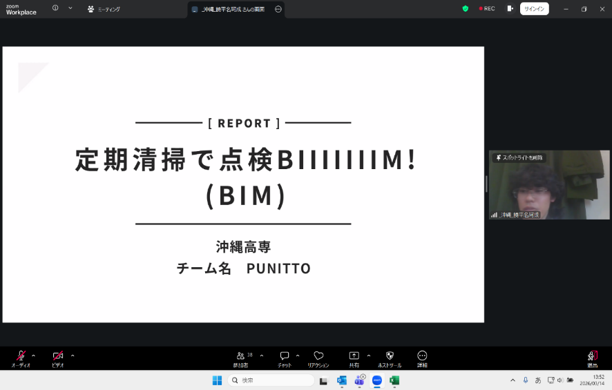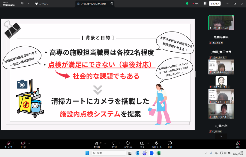 続きまして、沖縄高専チームより「定期清掃で点検BIIIIIIIM!」のタイトルで発表をしていただきました。