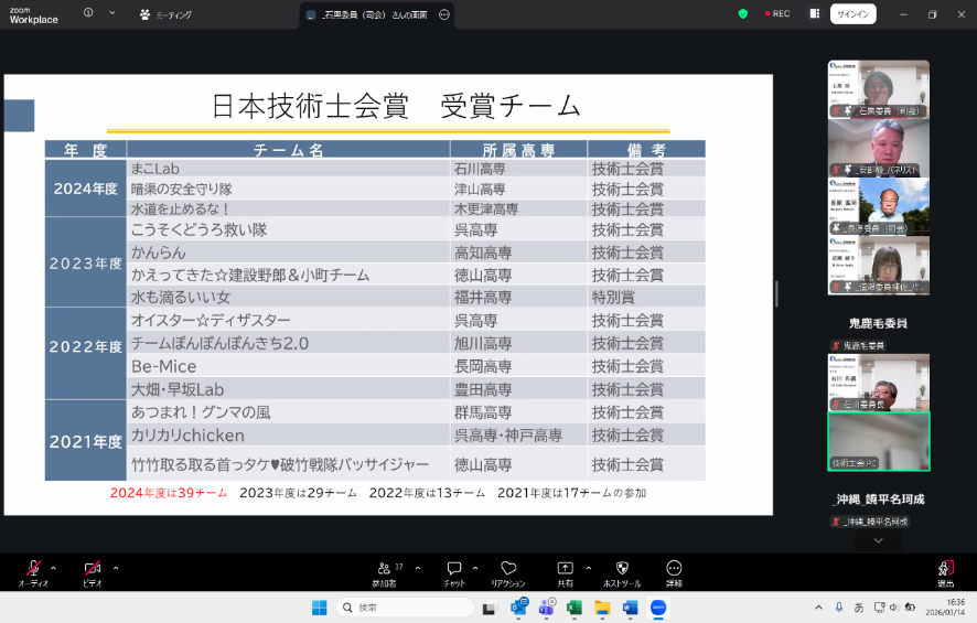 石川委員長からのご説明とインフラテクコン事務局 田村裕美様からのご挨拶をいただいた後、各高専チームよりプレゼンテーションを行っていただきました。